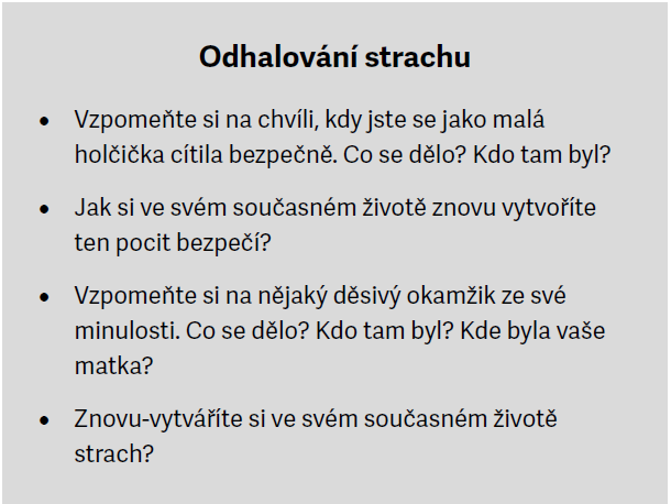 Mnohé z vás jsou unavené. Celé roky se snažíte chránit a jste vyčerpané z přílišné práce, z přejídání a podvýživy nebo z destruktivních způsobů milování. Závislost může začít jako způsob, jak uklidnit matku a přizpůsobit se její zranitelnosti. Návykové chování začíná nevinnou nadějí, že když prostě udělám správnou věc (řeknu správnou věc, budu hodná), bude mě chránit a milovat. Budu se moct uklidnit. Dr. Gábor Maté tvrdí, že: „Jádrem každé závislosti je prázdnota, která vychází ze strachu.“ Závislost je pokusem o regulaci strachu a zoufalství – strachu z toho, že nejsme hodni lásky, nebo že jsme sami, strachu, který bez základního pocitu bezpečí roste.